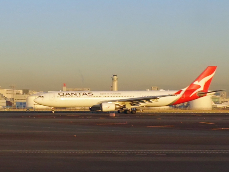 なかなか撮影するチャンスの少ないカンタス航空の機材をD滑走路を離陸中の機内から撮影