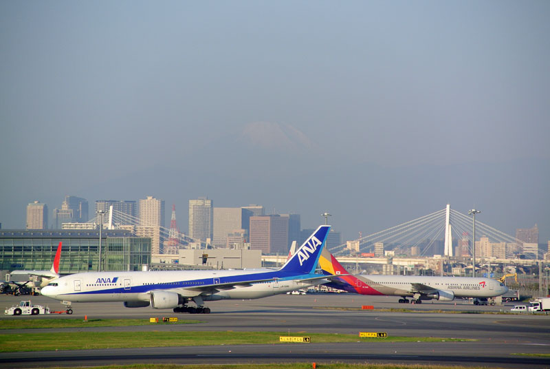 搭乗前のJALラウンジからの写真で薄曇りの空に少しだけ富士山の姿が見えます。雪で白くなっているのでなんとか確認できる程度で離陸後に見えるかが心配です。