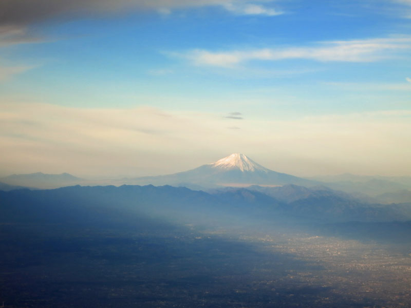 薄曇りで見通しがあまり良くなかったですが、手前の丹沢山塊が黒っぽくその向こうに富士山が見えてきました。