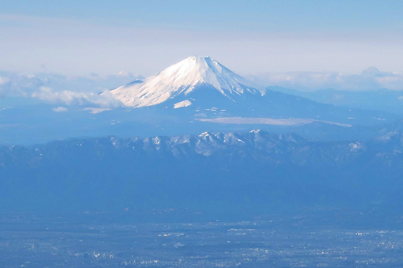 北に向かう便なので手前に山脈があり、その向こうに富士山が見えます。手前の山脈は丹沢山塊でその向こうに陸上自衛隊の富士演習場が見え、その向こうに富士山とかなり条件がよかったのでハッキリと写りました。