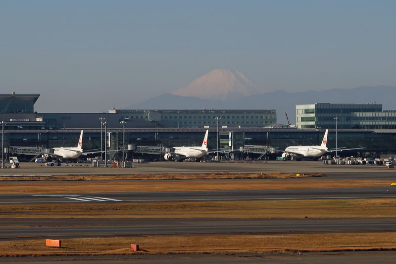 冬は空気が澄んでいて富士山がハッキリ見える日が多いのですがこの日はもやっていました。国際線ターミナルにJAL機が並んでいてその向こうに富士山が見えました。