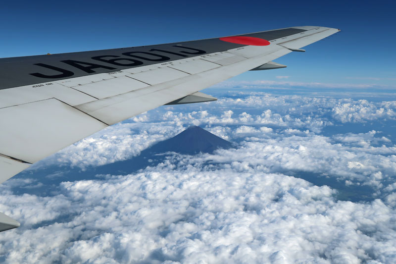 夏の富士山は雪がなく真っ黒で映えないのですが雲も多く周りが白いので少し目立っています。乗っているのはBoeingの767で少し古い機材で翼も新素材ではなく金属製でまっすぐで無骨な感じです。