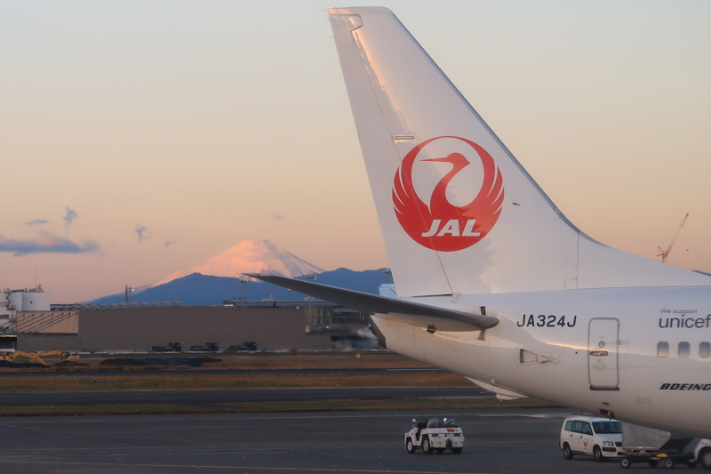 搭乗した機内から出発前のプッシュバックの時に隣に駐機していたJAL機と一緒に撮影。朝の時間で少しピンク色に。