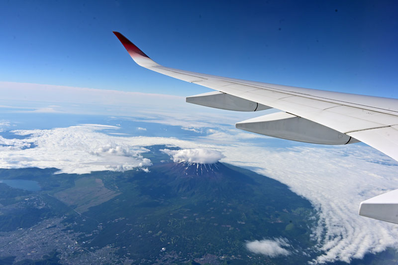羽田から福岡の便は富士山の北側を飛行します。この日は富士山の山頂に帽子の様に雲が掛かっていました。広角域で撮影し左には山中湖が、大きく見える翼は優雅な曲線を描くエアバスA350の翼です。