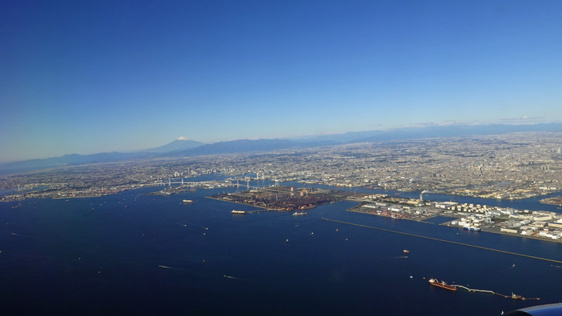 冬の羽田空港を離陸して南に向かう便は3回の富士山Viewがあります。一回目はD滑走路に向かう時の連絡橋からで二回目は離陸直後で三回目は富士山付近を飛行中です。 この写真は離陸直後の撮影で富士山のアップは三回目で充分に撮影できるので横浜のベイブリッジなどの風景と一緒に撮影しました。
