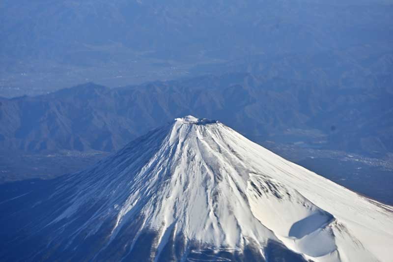 富士山の横を通り過ぎた後に撮影したもので宝永火口は東からの太陽の影が黒くなっています。