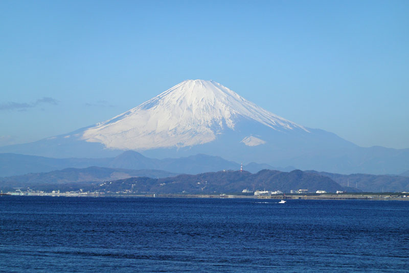 冬の時期は空気が澄んでいるので遠くからでも富士山が見えます。自転車で江の島タッチをして片瀬江ノ島海岸で海越しの撮影をしました。